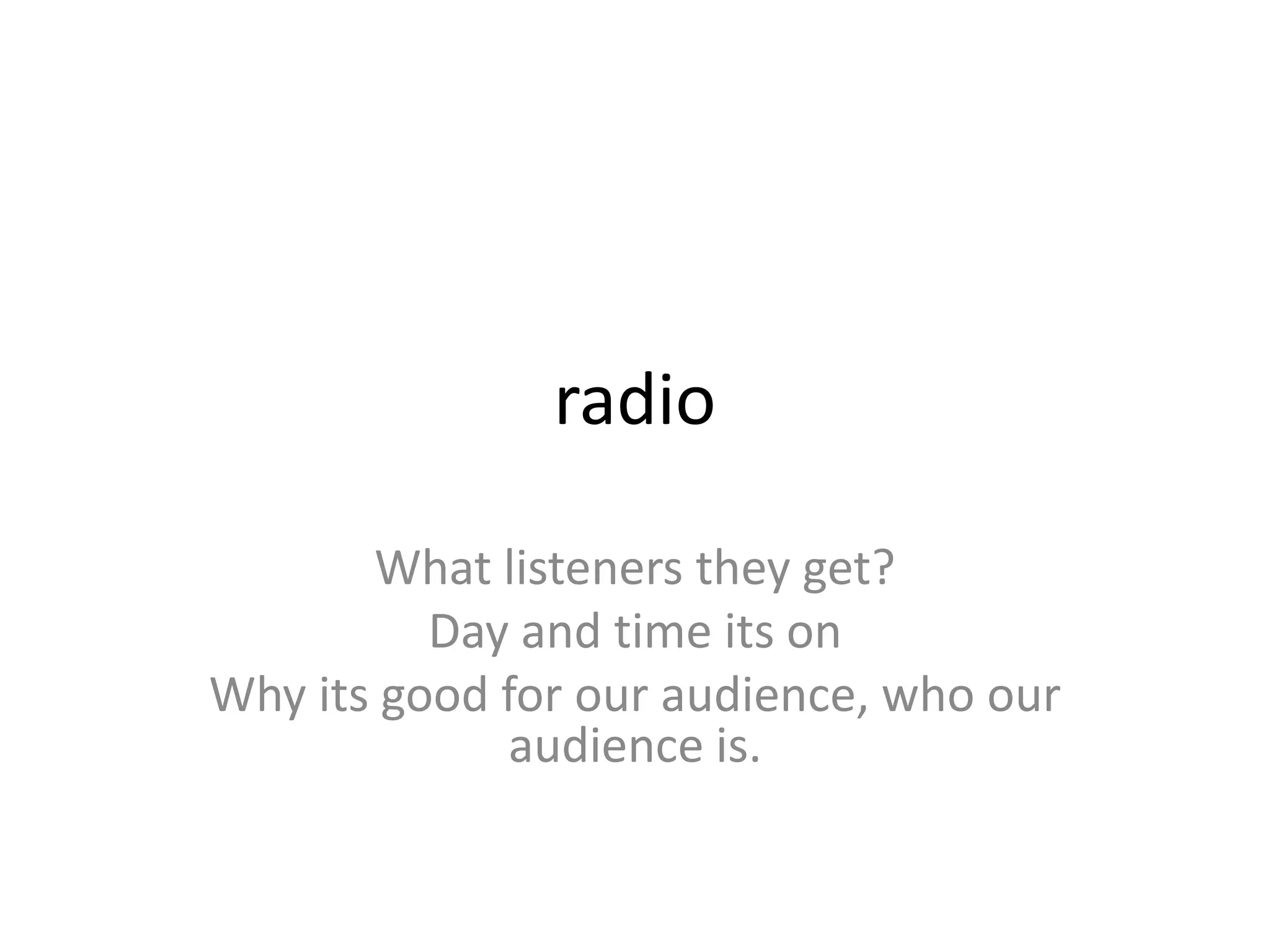 This document provides information about several radio stations that could be used to advertise a fast food documentary. It describes BBC Radio 1, which broadcasts popular music and chart hits to ages 15-29, especially after 7pm when it plays alternative genres. Capital FM is described as a network of hit radio stations targeting ages 15-34. Key 103 specifically serves Manchester with contemporary pop and dance. XFM plays alternative indie pop music.