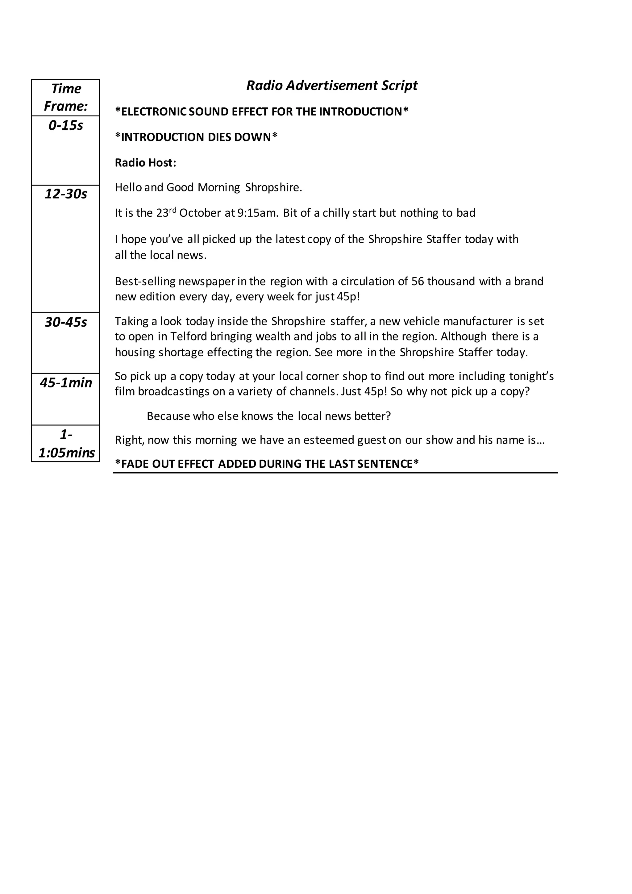 A radio advertisement promotes the local Shropshire Staffer newspaper. It notes the newspaper has a circulation of 56,000 copies and is the best-selling newspaper in the region. The advertisement highlights some local news stories that will be featured in the current edition, such as a new vehicle manufacturer opening and a housing shortage. It encourages listeners to purchase a copy of the newspaper from their local shop for 45p to read more local news and entertainment listings.
