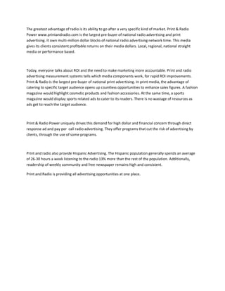 Radio advertising is a cost-effective method for businesses to reach specific target markets, leveraging the medium's long history and continued relevance. It combines direct response and traditional advertising strategies to enhance return on investment, particularly for the Hispanic demographic, which spends significant time listening to the radio. Print & Radio Power serves as a major player in national advertising, facilitating both radio and print options to maximize client profits.