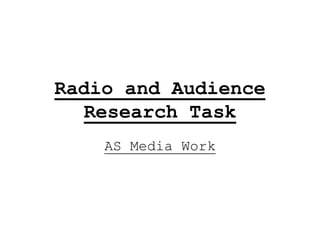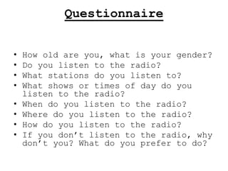 The document describes a questionnaire given to 10 people about their radio listening habits. It collected demographic information and asked questions about what stations and shows they listen to, when and where they listen, and how they listen. The results were recorded in tables and graphs. Most people listened to radio, with Radio 1 and 2 being the most popular stations. Most listened in their homes, cars, or bedrooms using a traditional radio rather than other devices. A few preferred other activities like reading or listening to their own music instead of radio.