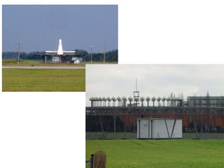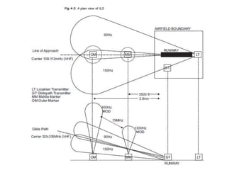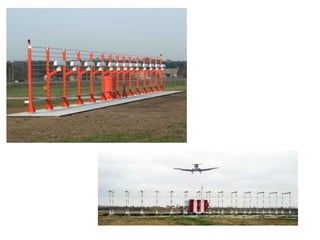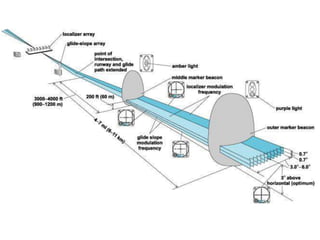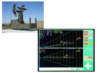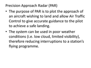 Precision Approach Radar (PAR) allows air traffic control to guide aircraft to the runway with accurate guidance during poor weather conditions when visibility is limited. PAR consists of a rotating radar head that transmits beams to detect and track aircraft on their approach. Controllers can view the aircraft's elevation and azimuth scans on screens and guide the aircraft along the safe glide path to land. Instrument Landing System (ILS) provides automated guidance for aircraft landings without relying on ground controllers. ILS includes transmitters that provide horizontal and vertical guidance information to pilots, allowing them to align with the runway centerline and glide slope for landing. Weather radar detects precipitation and analyzes its motion and type to determine storm structure and potential for severe weather.