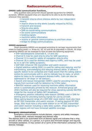 ffuunnccttiioonnss__ OOnnllyy qquuaalliiffiieedd rraaddiioo ppeerrssoonnnneell sshhoouulldd ooppeerraattee eeqquuiippmmeenntt ffoorr GGMMDDSSSS ppuurrppoosseess.. GGMMDDSSSS eeqquuiippppeedd sshhiippss aarree rreeqquuiirreedd ttoo bbee aabbllee ttoo ddoo tthhee ffoolllloowwiinngg wwhheerreevveerr tthheeyy ooppeerraattee:: •• ttrraannssmmiitt sshhiipp--ttoo--sshhoorree ddiissttrreessss aalleerrttss bbyy ttwwoo iinnddeeppeennddeenntt mmeeaannss;; •• rreecceeiivvee sshhoorree--ttoo--sshhiipp aalleerrttss ((uussuuaallllyy rreellaayyeedd bbyy RRCCCCss));; •• ttrraannssmmiitt aanndd rreecceeiivvee:: •• SShhiipp--ttoo--sshhiipp aalleerrttss •• SSAARR ccoo--ccoooorrddiinnaattiinngg ccoommmmuunniiccaattiioonnss •• OOnn--sscceennee ccoommmmuunniiccaattiioonnss •• llooccaattiinngg ssiiggnnaallss •• mmaarriittiimmee ssaaffeettyy iinnffoorrmmaattiioonn •• rroouuttiinnee oorr ggeenneerraall ccoommmmuunniiccaattiioonnss ttoo aanndd ffrroomm sshhoorree •• bbrriiddggee--ttoo--bbrriiddggee ccoommmmuunniiccaattiioonnss.. GGMMDDSSSS eeqquuiippmmeenntt SShhiippss ooppeerraattiinngg GGMMDDSSSS aarree eeqquuiippppeedd aaccccoorrddiinngg ttoo ccaarrrriiaaggee rreeqquuiirreemmeennttss tthhaatt rreellaattee ttoo ttrraaddiinngg aarreeaass ii..ee.. AArreeaass AA11,, AA22,, AA33 aanndd AA44 aass ssttiippuullaatteedd iinn SSOOLLAASS.. AAllll sshhiippss ooppeerraattiinngg GGMMDDSSSS ccaann bbee eexxppeecctteedd ttoo hhaavvee aatt lleeaasstt tthhee ffoolllloowwiinngg eeqquuiippmmeenntt:: •• VVHHPP rraaddiiootteelleepphhoonnee ((CChhaannnneellss 66,, 1133 aanndd 1166)):: •• CChhaannnneell 66 mmaayy bbee uusseedd sshhiipp--ttoo--sshhiipp ffoorr SSAARR ooppeerraattiioonnss •• CChhaannnneell 1133 iiss uusseedd ffoorr ssaaffeettyy ooff nnaavviiggaattiioonn sshhiipp--ttoo--sshhiipp •• CChhaannnneell 1166 iiss uusseedd ffoorr ddiissttrreessss aanndd uurrggeennccyy ttrraaffffiicc,, aanndd mmaayy bbee uusseedd bbyy aaii rrcc rraaff tt ffoorr ssaaffeettyy ppuurrppoosseess;; •• VVHHPP DDSSCC ((CChhaannnneell 7700)) ttrraannssmmiitttteerr aanndd wwaattcchh rreecceeiivveerr:: •• DDiiggiittaall sseelleeccttiivvee ccaalllliinngg ((DDSSCC)) iiss uusseedd ffoorr ccaalllliinngg aanndd rreeppllyyiinngg,, aanndd ffoorr ttrraannssmmiittttiinngg,, aacckknnoowwlleeddggiinngg aanndd rreellaayyiinngg ddiissttrreessss aalleerrttss.. IItt aalllloowwss aa ssppeecciiffiicc ssttaattiioonn ttoo bbee ccoonnttaacctteedd aanndd mmaaddee aawwaarree tthhaatt tthhee ccaalllliinngg ssttaattiioonn wwiisshheess ttoo ccoommmmuunniiccaattee wwiitthh iitt,, aanndd ttoo iinnddiiccaattee hhooww ttoo rreeppllyy,, oorr wwhhiicchh ssttaattiioonn ttoo lliisstteenn ttoo ffoorr ssuubbsseeqquueenntt ddiissttrreessss ttrraaffffiicc.. CCaallllss ccaann aallssoo bbee aaddddrreesssseedd ttoo ''aallll sshhiippss'' oorr ''aallll ssttaattiioonnss'';; •• SSeeaarrcchh aanndd rreessccuuee ttrraannssppoonnddeerr ((SSAARRTT)) uusseedd ffoorr pprroovviiddiinngg hhoommiinngg ssiiggnnaallss ffrroomm ssuurrvviivvaall ccrraafftt ffoorr ddeetteeccttiioonn bbyy 99 GGHHzz rraaddaarr;; •• NNAAVVTTEEXX rreecceeiivveerr uusseedd ffoorr rreecceeiivviinngg mmaarriittiimmee ssaaffeettyy iinnffoorrmmaattiioonn wwhhiicchh iiss aauuttoommaattiiccaallllyy pprriinntteedd bbyy tthhee rreecceeiivveerr.. EEnnhhaanncceedd ggrroouupp ccaallll ((EEGGCC)) ffaacciilliittiieess wwiillll aallssoo bbee rreeqquuiirreedd ffoorr sshhiippss ooppeerraattiinngg oouuttssiiddee NNAAVVTTEEXX rraannggee ffoorr tthhee rreecceeiipptt ooff SSaaffeettyy NNEETT bbrrooaaddccaassttss;; •• EEmmeerrggeennccyy ppoossiittiioonn iinnddiiccaattiinngg rraaddiioo bbeeaaccoonn ((EEPPIIRRBB)) uusseedd iinn SSAARR ffoorr aalleerrttiinngg aanndd ffoorr pprroovviiddiinngg hhoommiinngg ssiiggnnaallss ffoorr uussee bbyy aaiirrccrraafftt.. SShhiippss ssaaiilliinngg bbeeyyoonndd rraannggee ooff aa VVHHPP DDSSCC ccooaasstt ssttaattiioonn mmuusstt aallssoo hhaavvee aann MMFF DDSSCC ttrraannssmmiitttteerr aanndd wwaattcchh rreecceeiivveerr.. IIff ssaaiilliinngg bbeeyyoonndd MMFF DDSSCC rraannggee,, tthheeyy mmuusstt hhaavvee aa sshhiipp eeaarrtthh ssttaattiioonn oorr aann HHFF DDSSCC ttrraannssmmiitttteerr aanndd wwaattcchh rreecceeiivveerr iinncclluuddiinngg aa rraaddiioo tteelleexx ssyysstteemm.. SShhiippss ooppeerraattiinngg iinn ppoollaarr rreeggiioonnss wwiillll nnoott hhaavvee IInnmmaarrssaatt ssaatteelllliittee ccoovveerraaggee.. EEmmeerrggeennccyy ccoommmmuunniiccaattiioonnss EEmmeerrggeennccyy ccoommmmuunniiccaattiioonnss iinncclluuddee ddiissttrreessss,, uurrggeennccyy aanndd ssaaffeettyy mmeessssaaggeess.. DDiissttrreessss aalleerrtt,, ddiissttrreessss mmeessssaaggee aanndd ddiissttrreessss rreellaayy TThhee ddiissttrreessss aalleerrtt iiss aann aauuttoommaatteedd ffoorrmm ooff ddiissttrreessss ssiiggnnaall aanndd iinnddiiccaatteess tthhaatt aa sshhiipp,, aaiirrccrraafftt oorr ootthheerr vveehhiiccllee,, oorr aa ppeerrssoonn,, iiss iinn ggrraavvee aanndd iimmmmiinneenntt ddaannggeerr aanndd rreeqquuiirreess iimmmmeeddiiaattee aassssiissttaannccee.. IItt mmaayy ccoonnttaaiinn aallll oorr ssoommee ooff tthhee iinnffoorrmmaattiioonn ccoonnttaaiinneedd iinn tthhee ddiissttrreessss mmeessssaaggee..
