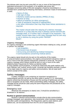 mmaayy bbee sseenntt uussiinngg DDSSCC oonn oonnee oorr mmoorree ooff tthhee ffrreeqquueenncciieess ddeeddiiccaatteedd eexxcclluussiivveellyy ttoo tthhee ppuurrppoossee,, oorr bbyy ssaatteelllliittee ((sseeee aannnneexx AA66)).. MMeessssaaggeess ccoonncceerrnniinngg ssaaffeettyy ooff lliiffee aanndd nnaavviiggaattiioonn sshhoouulldd bbee ttrraannssmmiitttteedd iinn aa ssttaannddaarrdd ffoorrmm ccoonnttaaiinniinngg tthhee ffoolllloowwiinngg iinnffoorrmmaattiioonn,, wwhhiicchheevveerr mmooddee ooff ttrraannssmmiissssiioonn iiss uusseedd:: •• NNaammee ooff sshhiipp;; •• CCaallll ssiiggnn ooff sshhiipp;; •• MMaarriittiimmee mmoobbiillee sseerrvviiccee iiddeennttiittyy ((MMMMSSII)) ooff sshhiipp;; •• PPoossiittiioonn ooff sshhiipp;; •• NNaattuurree ooff ddiissttrreessss ((oorr ootthheerr eemmeerrggeennccyy));; •• TTyyppee ooff aassssiissttaannccee rreeqquuiirreedd ((iiff aapppprroopprriiaattee));; •• aannyy ootthheerr iinnffoorrmmaattiioonn tthhaatt mmaayy hheellpp tthhoossee wwhhoossee aassssiissttaannccee iiss rreeqquuiirreedd.. TThhee mmaasstteerr sshhoouulldd oorrddeerr tthhee rreellaayyiinngg ooff aa ddiissttrreessss mmeessssaaggee wwhheenneevveerr iitt iiss cclleeaarr tthhaatt tthhee sshhiipp iinn ddiissttrreessss ccaannnnoott ttrraannssmmiitt tthhee mmeessssaaggee iittsseellff,, oorr iiff ffuurrtthheerr hheellpp iiss tthhoouugghhtt ttoo bbee nneecceessssaarryy.. TThhee mmaasstteerr sshhoouulldd mmaakkee cclleeaarr iinn tthhee rreellaayy mmeessssaaggee tthhaatt hhiiss oowwnn sshhiipp iiss nnoott iinn ddiissttrreessss bbyy uussiinngg tthhee pprreeffiixx ''MMAAYYDDAAYY RREELLAAYY''.. UUrrggeennccyy mmeessssaaggeess AAnn uurrggeennccyy mmeessssaaggee iiss oonnee ccoonnttaaiinniinngg uurrggeenntt iinnffoorrmmaattiioonn rreellaattiinngg ttoo aa sshhiipp,, aaiirrccrraafftt oorr ppeerrssoonn.. FFoorr eexxaammppllee:: •• LLoosstt pprrooppeelllleerr;; •• PPeerrmmaanneenntt lloossss ooff ppoowweerr;; •• AAnnnnoouunncciinngg aanndd iiddeennttiiffyyiinngg mmeeddiiccaall ttrraannssppoorrttss;; •• CCoommmmuunniiccaattiioonnss ccoonncceerrnniinngg mmeeddiiccaall aaddvviiccee.. TThhee uurrggeennccyy ssiiggnnaall sshhoouulldd oonnllyy bbee sseenntt oonn tthhee aauutthhoorriittyy ooff tthhee mmaasstteerr.. IIff uussiinngg tteerrrreessttrriiaall ccoommmmuunniiccaattiioonnss,, tthhee uurrggeennccyy aannnnoouunncceemmeenntt sshhoouulldd bbee mmaaddee oonn oonnee oorr mmoorree ooff tthhee DDSSCC ddiissttrreessss ffrreeqquueenncciieess ccoonnttaaiinneedd iinn aannnneexx AA66.. TThhee aaccttuuaall uurrggeennccyy mmeessssaaggee wwhhiicchh ffoolllloowwss sshhoouulldd bbee sseenntt oonn oonnee oorr mmoorree ooff tthhee rraaddiioo tteelleepphhoonnyy//tteelleexx ffrreeqquueenncciieess ffoorr ffoollllooww--uupp ddiissttrreessss ttrraaffffiicc.. IIff uussiinngg ssaatteelllliittee ccoommmmuunniiccaattiioonnss,, iitt sshhoouulldd bbee nnootteedd tthhaatt sshhiipp eeaarrtthh ssttaattiioonnss oonnllyy hhaavvee ''ddiissttrreessss'' aanndd ''rroouuttiinnee'' pprriioorriittyy lleevveellss.. IInnmmaarrssaatt hhaass tthheerreeffoorree ddeevviisseedd aa ssyysstteemm ooff ttwwoo--ddiiggiitt ccooddeess ffoorr uurrggeennccyy aanndd ssaaffeettyy ccoommmmuunniiccaattiioonnss.. NNoott aallll ccooaasstt eeaarrtthh ssttaattiioonnss aacccceepptt aallll tthhee ccooddeess.. SSaaffeettyy mmeessssaaggeess AA ssaaffeettyy mmeessssaaggee iiss oonnee ccoonnttaaiinniinngg aann iimmppoorrttaanntt nnaavviiggaattiioonnaall oorr mmeetteeoorroollooggiiccaall wwaarrnniinngg.. AAss wweellll aass tthhee iitteemmss lliisstteedd iinn sseeccttiioonn 33..77..22,, iinnffoorrmmaattiioonn rreeppoorrttss ccoonncceerrnniinngg tthhee ppoossiittiioonn ooff bbuuooyyss aanndd tthhee wwoorrkkiinngg ooff lliigghhtthhoouusseess aanndd ootthheerr aaiiddss ttoo nnaavviiggaattiioonn ccaann bbee mmaaddee.. WWhheenn ttrraannssmmiittttiinngg ssaaffeettyy mmeessssaaggeess,, tthhee ssaaffeettyy mmeessssaaggee ffoorrmmaatt sshhoouulldd bbee uusseedd uussiinngg tthhee ssaammee ffrreeqquueenncciieess aanndd pprroocceedduurreess aass ffoorr uurrggeennccyy mmeessssaaggeess.. EEmmeerrggeennccyy oovveerr WWhheenneevveerr tthhee eemmeerrggeennccyy iiss cclleeaarrllyy oovveerr,, iitt sshhoouulldd bbee ccaanncceelllleedd bbyy aa bbrrooaaddccaasstt ttoo ''aallll ssttaattiioonnss''.. RRoouuttiinnee oorr ggeenneerraall ccoommmmuunniiccaattiioonnss RRoouuttiinnee oorr ggeenneerraall ccoommmmuunniiccaattiioonnss iinncclluuddee sshhiipp--ttoo--sshhiipp ccoommmmuunniiccaattiioonn,, ppiilloottaaggee mmeessssaaggeess,, ppoorrtt ooppeerraattiioonnss,, sshhiipp mmoovveemmeennttss,, sshhiipp''ss bbuussiinneessss mmeessssaaggeess aanndd ootthheerr ppuubblliicc ccoorrrreessppoonnddeennccee.. TThhee ffrreeqquueenncciieess uusseedd bbyy ccooaasstt ssttaattiioonnss,, ppoorrtt ssttaattiioonnss eettcc.. ccaann bbee aasscceerrttaaiinneedd ffrroomm tthhee IITTUU LLiisstt ooff CCooaasstt SSttaattiioonnss..