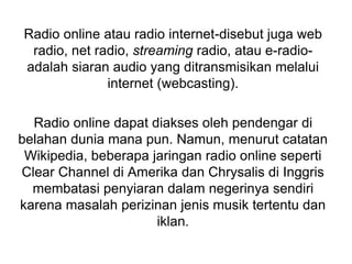 Radio dan TV online menggunakan teknologi streaming untuk mengirim konten audio dan video secara langsung melalui internet. Format audio yang populer untuk radio online adalah MP3, Ogg Vorbis, dan AAC, sementara pengguna dapat mengakses konten melalui berbagai perangkat termasuk komputer dan ponsel. TV online menawarkan konten video yang dapat diakses secara daring dan sering kali diperbarui, serta dapat disiarkan secara pribadi atau oleh per