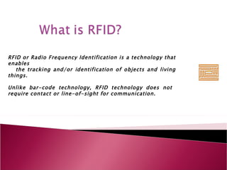 Radio Frequency Identification (RFID) technology allows for the tracking and identification of various objects and living beings without the need for contact or line-of-sight. RFID systems consist of tags, antennas, readers, and software, with tags capable of storing more information than barcodes and some having the ability to record environmental data. The technology has diverse applications, including in inventory management, authentication, contactless payments, and more.