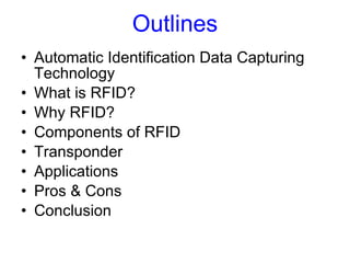 Radio frequency identification (RFID) is an automatic data capture technology that uses radio waves to electronically identify objects. RFID systems consist of RFID tags attached to objects, RFID readers to interrogate the tags, and a host computer system to process the data collected. RFID tags can be either passive, active, or semi-passive. Passive tags have no internal power source and must derive power from the reader, while active tags have an internal power source to transmit signals to the reader. RFID is used for applications such as tracking inventory and assets, cashless payments, and electronic access control because it allows for contactless identification of multiple tags simultaneously.