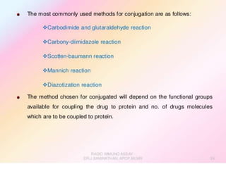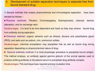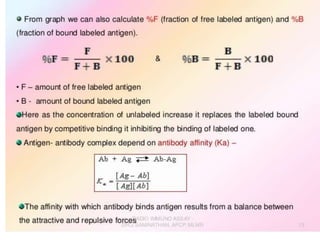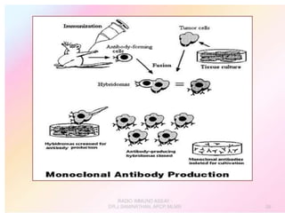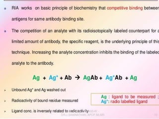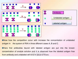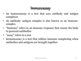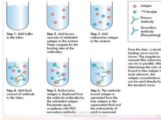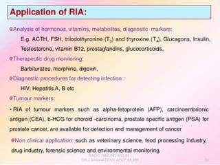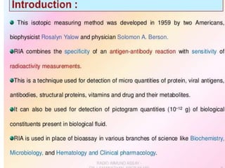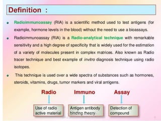 Centrifuges and radioactive counters are the two most vital pieces of equipment needed for radioimmunoassay. An effective centrifuge should be capable of 1200-2500 rpm and is preferably a swing-bucket rotor model to easily remove supernatant. Gamma counters are used to detect gamma-emitting isotopes like Iodine-125, while scintillation counters can detect other isotopes.