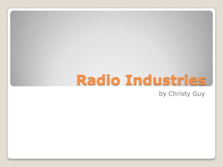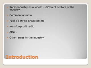 The radio industry consists of commercial radio, funded by advertising; public service broadcasting like the BBC, funded by television licenses; and non-profit radio. Commercial radio stations employ 43% of the radio workforce and make money through advertising. The BBC employs nearly 11,000 people and has over half of all radio listening hours in the UK. New technologies allow radio to be accessed online, on mobile apps, and through podcasts. The industry is regulated by organizations like OFCOM and employs people in a variety of roles from producers and presenters to reporters. In the future, the radio industry will need a multi-skilled workforce that can create compelling content across different platforms.