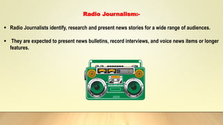 The document provides information about radio journalism. It discusses that radio journalists identify, research and present news stories for various audiences. They are expected to present news bulletins, record interviews, and voice news items or longer features. The document also describes the different components of a radio studio including the announcer's booth, control room, transmitter, and sound lock. It outlines the process of scripting for radio including keeping stories short and simple, using simple language, and including sound bites. The summary provides high-level information about radio journalism in 3 sentences.