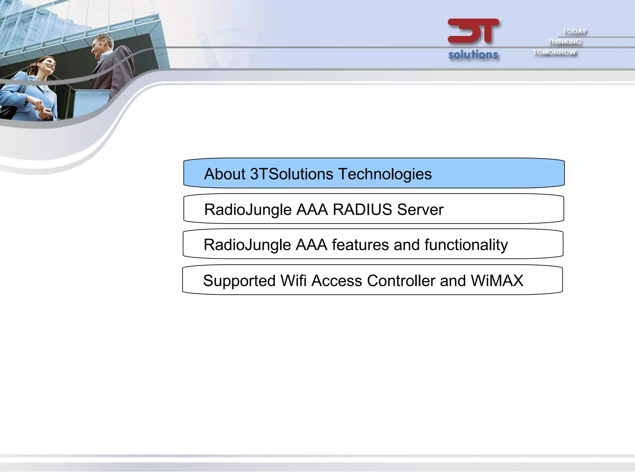 The document provides an overview of the Radiojungle AAA Radius Server (RJ AAA), designed for WISP companies, featuring high performance and a fully web-based interface. It supports various technologies such as broadband, WLAN, public Wi-Fi hotspots, and WIMAX, and offers functionalities including authentication, bandwidth control, and user management. The server is based on FreeRadius 2.x, operating on a customized FreeBSD system, and supports integration with multiple access controllers.