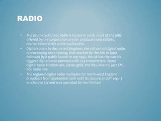 Radio broadcasting involves one-way wireless transmission of audio to a wide audience. Public service broadcasting is a London-based musical duo that samples from old public information films and archive footage in their music released in 2010. The BBC is a major employer of radio producers, editors, journalists and broadcasters, with around 10,000 jobs in these areas in 2008. Digital radio rollout has been ongoing in the UK since the 1990s, with over 100 transmitters now broadcasting stations like Classic Gold, The Hits, Kiss100 and Jazz FM.