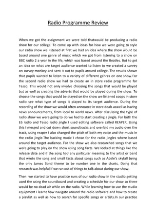The document summarizes a student's experience producing two radio shows for different audiences. For the first show aimed at college pupils, the student created a survey to determine the target audience preferred a variety of music genres. For the second show promoting products at Tesco, the student researched songs that fit the target customers and practiced using studio equipment to minimize dead air during broadcasts. While parts of the recorded shows could have been improved, the student believes both shows would appeal to their intended listeners.