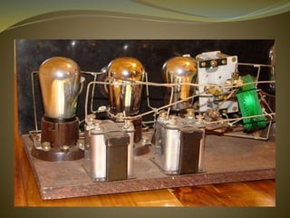 This document discusses the history and types of radio receivers. It describes how the earliest radio receiver was created in 1896 by Alexander Popov and was based on Maxwell's discovery of electromagnetic waves. There are three main types of receivers discussed - crystal radios, tuned radio frequency receivers, and superheterodyne receivers. Crystal radios require no power source beyond the radio waves themselves, while tuned radio frequency receivers have individually tuned amplifier stages and superheterodyne receivers mix signals to extract an intermediate frequency. The document also covers frequency ranges, sensitivity, selectivity and how radio waves propagate.