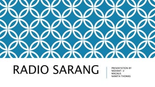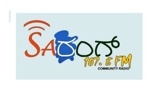 Radio Sarang is a community radio station established in 2009 in Mangalore, India by St. Aloysius College. It broadcasts in several local languages to promote local cultures and involve surrounding communities in daily programming. The 24-hour radio allows communities to voice concerns, share talents, and comment on relevant issues. By broadcasting without pre-recording and in multiple local tongues, Radio Sarang aims to unite India's diversity and give underrepresented groups a platform.