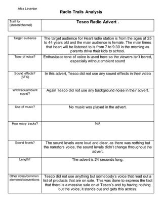 The radio advertisement from Tesco targeted females ages 25 to 44 who listen to Heart radio in the mornings. It used an enthusiastic narrator with no music, sound effects, or ambient noise. The straightforward ad listing sale items was only 24 seconds long to clearly communicate the message of a big sale through the narrator's voice alone.