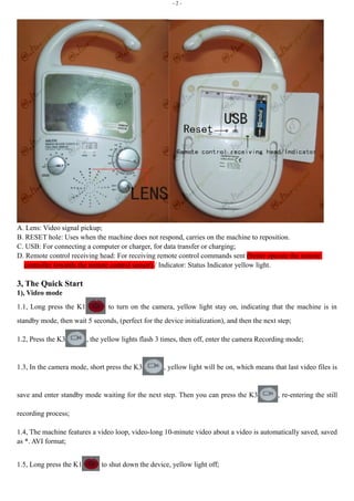 This document provides a user guide for a radio with a mirror camera. It describes the components of the device including indicators, power buttons, and recording modes. It then provides step-by-step instructions for using the basic functions like video recording, photo taking, and motion detection. Additional sections cover reading memory, charging the device, troubleshooting issues, and notes for proper use and care.