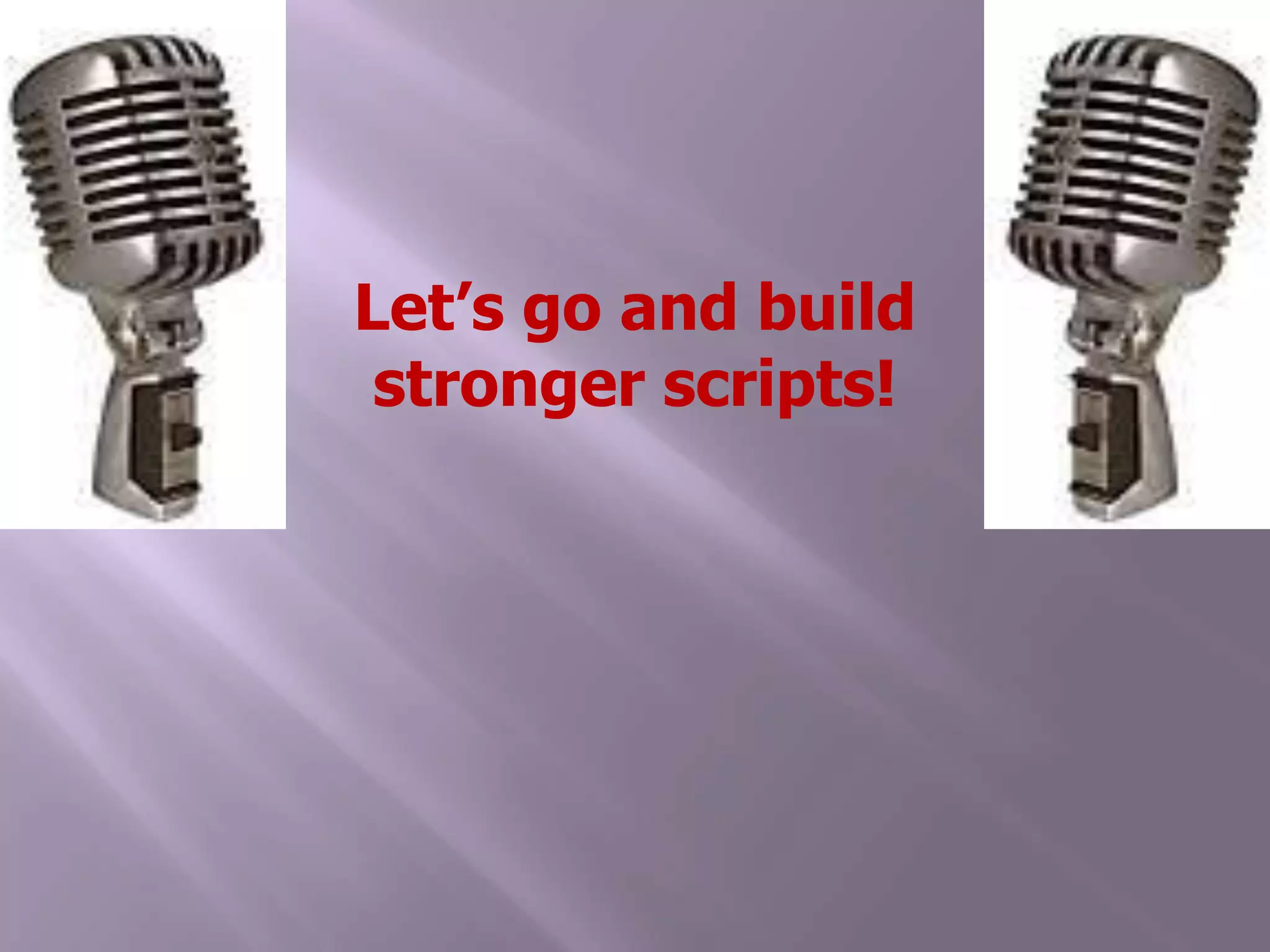 The document provides guidance for writing effective radio scripts. It discusses using dialogue and natural-sounding language to engage individual listeners. Descriptive writing and sound effects can help listeners visualize the story without visuals. Leaving brief silences can increase tension and signal changes. Effective scripts have a clear storyline, varied sentence lengths, and flow when read aloud. Researching topics ensures familiarity to discuss them conversationally.