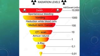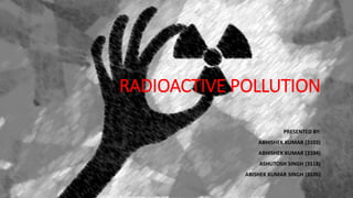 Radioactive pollution is defined as the emission of radioactive substances into the environment from human activities like nuclear processes, weapons production, mining, and medical and power generation waste. Sources include natural cosmic and terrestrial radiation as well as man-made activities. Exposure to radiation can damage DNA and lead to health issues like cancer depending on the duration and level of exposure. Preventive measures include limiting nuclear tests and waste, careful disposal, and treatment methods to reduce radioactivity in the environment.