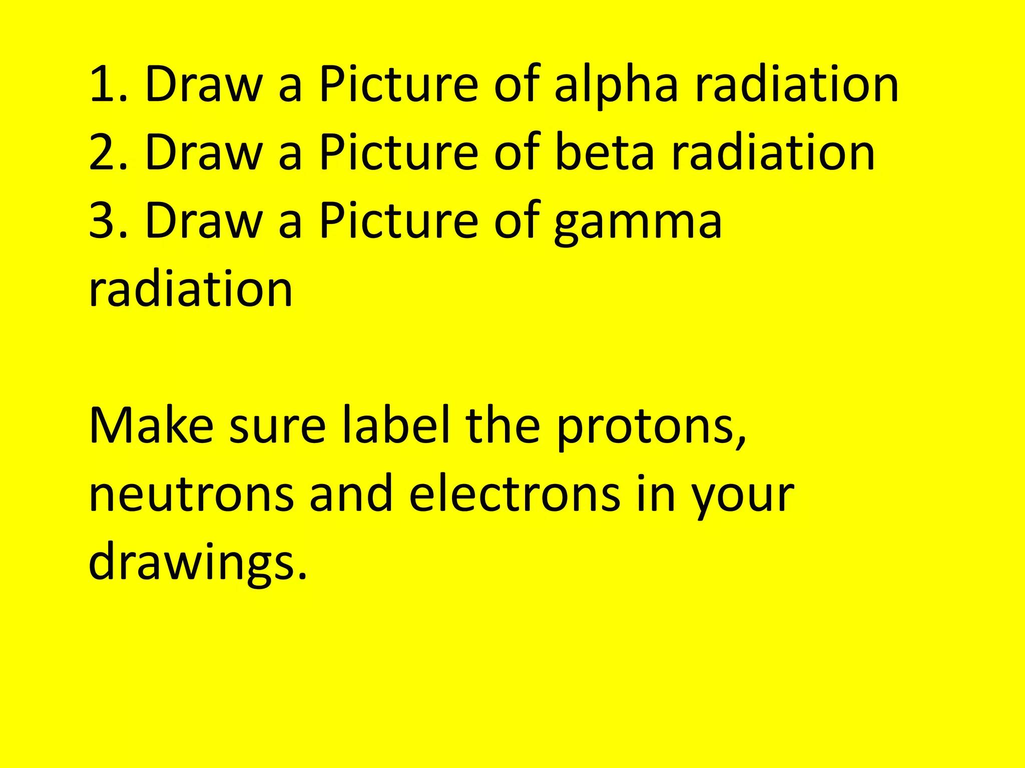 This document instructs the reader to draw pictures of three types of radiation: alpha, beta, and gamma. It also specifies that the drawings should label protons, neutrons, and electrons.