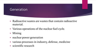 The document discusses radioactive waste management, detailing various waste types generated from nuclear operations including very low level waste, low-level waste, intermediate-level waste, and high-level waste. It outlines disposal methods such as deep geological disposal and advanced reprocessing technologies, emphasizing India's achievements in self-reliant radioactive waste management. The conclusion notes that responsible disposal is complex due to regulatory structures and ongoing technology upgrades to minimize discharges.
