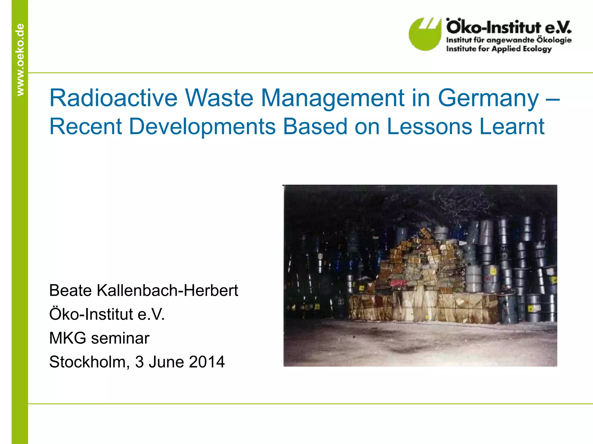 This document provides an overview of radioactive waste management in Germany, including recent developments and lessons learned. It discusses Germany's nuclear power history from 1957 to the present. It then summarizes the amounts and types of nuclear waste in Germany and describes facilities for low-level waste disposal, spent fuel storage and management, and the repository site selection process. Specific sites discussed include Asse, Konrad, Gorleben and others. The document is presented as part of an information seminar on the topic.