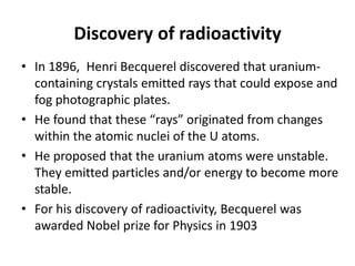 The document discusses radioactive decay and nuclear physics concepts. It describes the discovery of radioactivity by Henri Becquerel and the Curies. It defines key nuclear physics terms like isotopes, isobars, isotones. It explains the different types of radioactive decay including alpha, beta, positron decay and gamma emission. It discusses the penetration and ranges of different types of radiation. Finally, it covers the conservation of energy and mass in nuclear reactions based on Einstein's mass-energy equivalence formula.