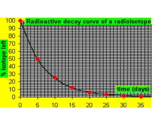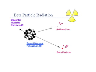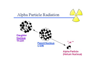The document discusses the stability of atomic nuclei and different types of radioactive decay. It explains that nuclei are stable when the nuclear binding forces outweigh the electrostatic repulsion between protons. Unstable nuclei undergo radioactive decay through processes like alpha, beta, or gamma emission to become more stable. The activity of a radioactive sample decreases exponentially over time according to the half-life. Different modes of decay include alpha emission by nuclei with too few neutrons, beta emission changing the number of protons and neutrons, and gamma emission releasing excess energy.