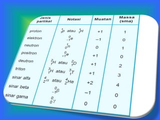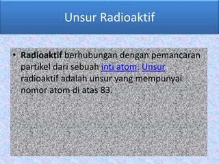 Dokumen tersebut membahas tentang unsur radioaktif dan radiasi. Unsur radioaktif adalah unsur dengan nomor atom di atas 83 yang memancarkan partikel dari inti atomnya secara spontan. Dokumen tersebut menjelaskan penemuan radiasi, jenis-jenis sinar radioaktif beserta sifatnya, proses peluruhan inti, dan dampak radiasi terhadap makhluk hidup.