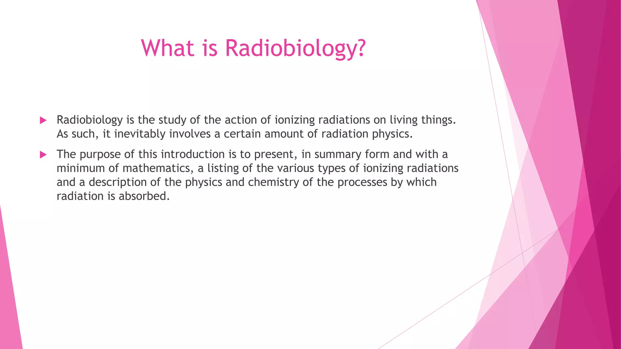 Radiobiology is the study of how ionizing radiation interacts with living things. This document provides an overview of different types of ionizing radiation including electromagnetic radiation like x-rays and gamma rays, and particulate radiation like electrons, protons, alpha particles, and heavy ions. It describes the physics of how this radiation is absorbed and can cause excitation or ionization in biological materials. Specifically, it notes that x-rays and gamma rays are indirectly ionizing since they produce fast-moving electrons upon absorption, while particulate radiations can directly ionize materials. Around 10,000 to 20,000 cases of lung cancer per year in the US are attributed to alpha particles from radon gas in homes.