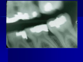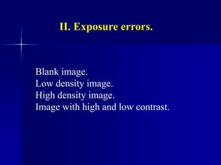 This document discusses common radiographic errors and artifacts that can occur during dental x-ray procedures. It identifies three main categories of errors: technique and projection errors, exposure errors, and processing errors. Technique errors include issues with patient preparation, film placement, and projection angles. Exposure errors result in over or underexposed images. Processing errors stem from chemical or film handling issues during development and fixing of the x-ray film. The document provides examples and explanations of specific errors like double images, cut-off areas, density problems, and chemical or physical marks that can affect image quality and interpretation.