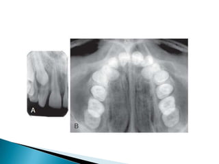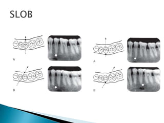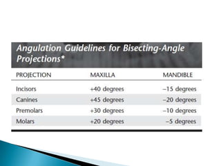 Periapical, bitewing, and occlusal radiographs provide different views for assessing teeth and surrounding structures. Periapical views show crowns, roots, and bone while bitewings show interproximal areas and the alveolar crest. Occlusals display large segments of dental arches. Each view has advantages like accuracy but also disadvantages like patient discomfort. Proper technique like receptor placement and central ray angulation are needed to minimize distortion. Managing pediatric patients and those prone to gagging requires relaxation, explanation, and distraction techniques.