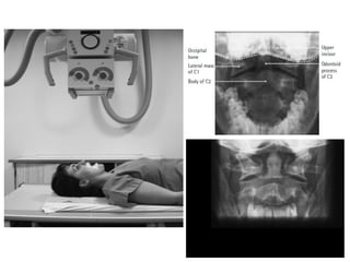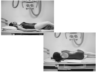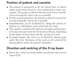This document provides positioning guidelines for radiographic imaging of the cervical spine, thoracic spine, lumbar spine, lumbo-sacral spine, and sacrum. It describes the standard views, patient preparation, positioning, tube and cassette centering, and exposure settings for each anatomical region. Proper patient positioning and radiographic technique are important to obtain diagnostic images while minimizing radiation dose.