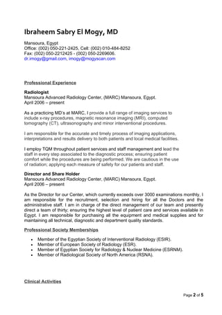 Dr. Ibraheem Sabry El Mogy is a radiologist in Egypt who is seeking opportunities to gain experience with advanced radiology techniques used in other countries. He has strong academic and clinical experience in Egypt and wishes to contribute his skills while also learning new procedures and technologies to bring back to help the people in his home country. He is confident that he can make significant contributions and complement international facilities with his skills and international perspective.