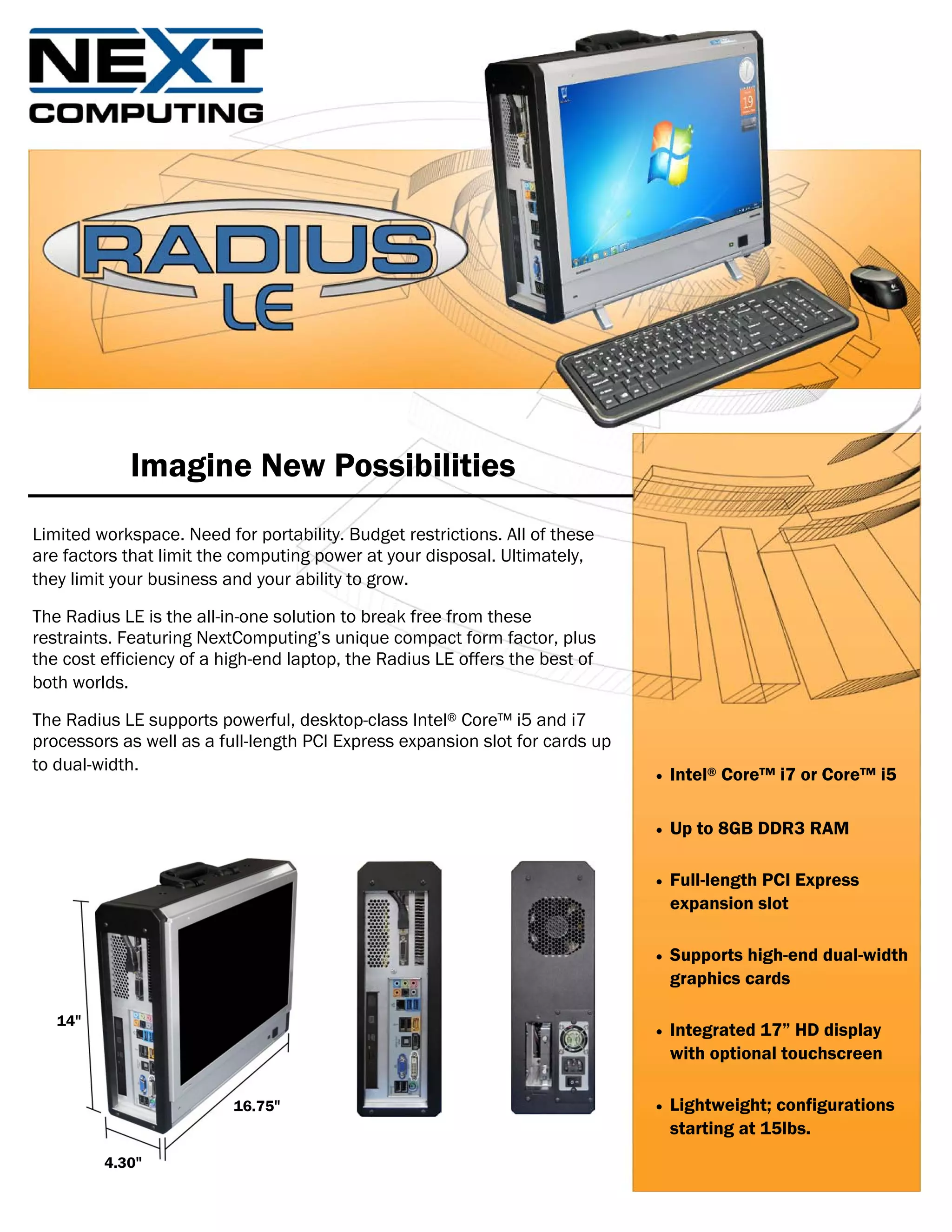 The Radius LE is an all-in-one computing solution that offers the power of a desktop in a compact, portable form factor. It features Intel Core i5 or i7 processors, up to 8GB RAM, a full-length PCIe expansion slot, and integrated 17-inch display. The Radius LE provides desktop-class performance while overcoming limitations of workspace, portability, and budget through its unique design.
