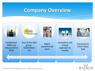 Radius Solutions is a staffing and consulting firm established in 2004 that provides staff augmentation, recruitment services, project delivery, and consultancy across various industries. It has a highly experienced team and focuses on innovative approaches and client value. The company offers flexible technical resources, project resources from start to finish, and utility-based IMAC services to reduce costs for clients.
