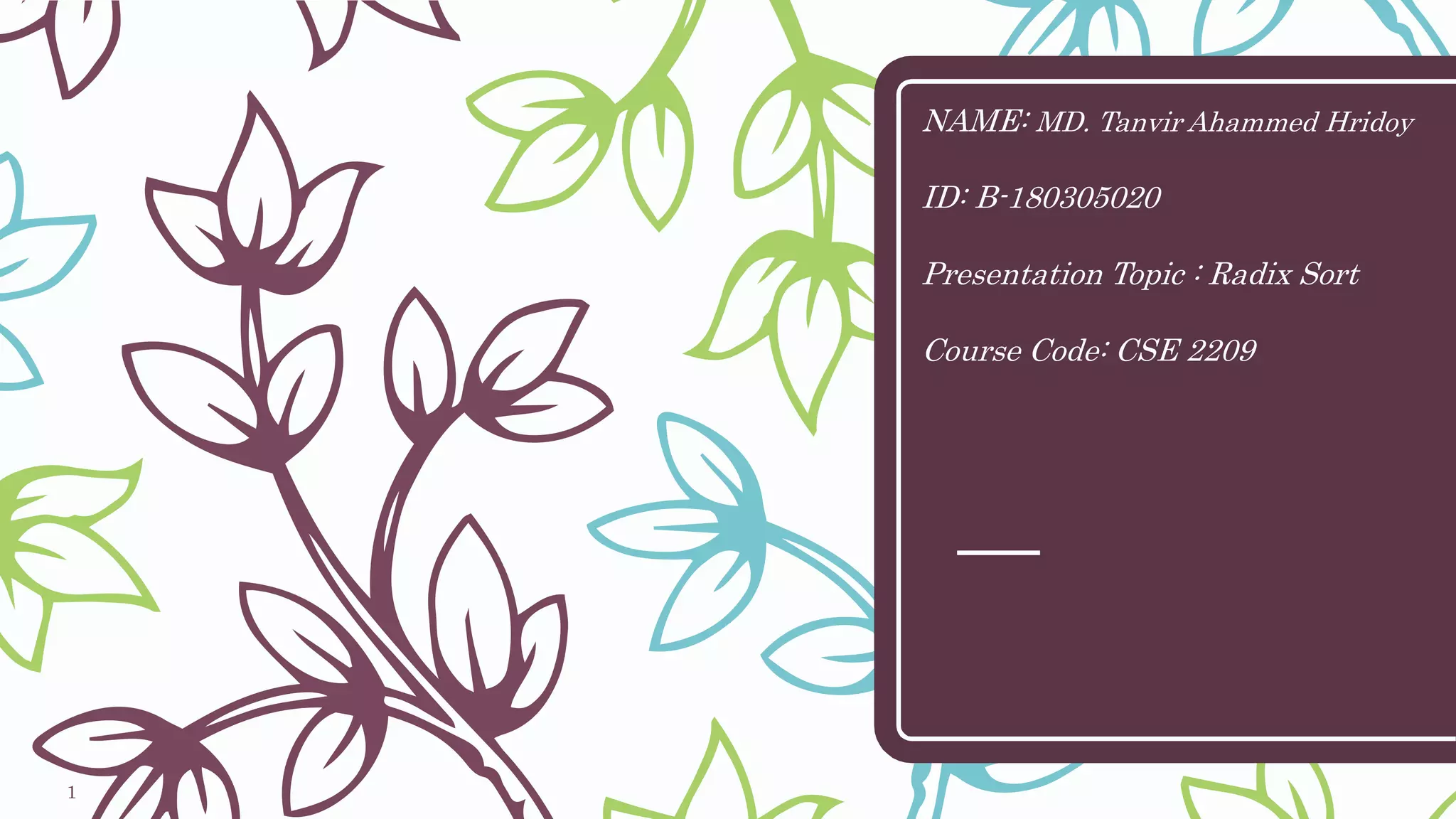 This document presents a summary of Radix Sort by MD. Tanvir Ahammed Hridoy. It begins with definitions of Radix Sort and discusses its history, properties, algorithm, complexity, an example, Java code, advantages and disadvantages. Radix Sort is a non-comparative sorting algorithm that sorts integers by grouping keys based on individual digit values and their significant positions. It has a linear runtime of O(n) and requires a minimum amount of space and data movement. Counting Sort is often used to sort each digit. While fast for small keys, Radix Sort only works for numbers with a fixed number of digits.