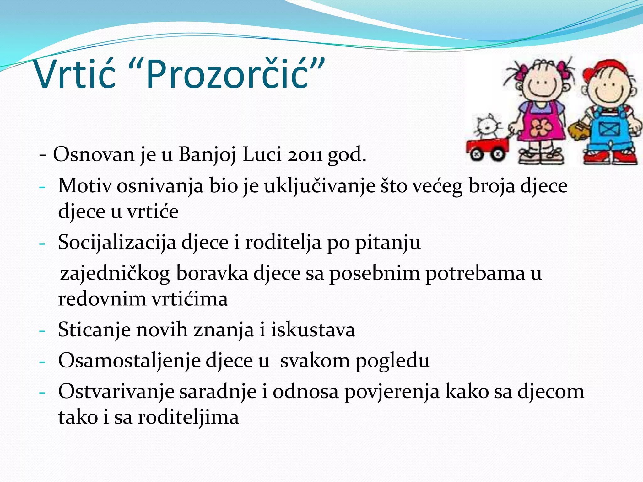Vrtić 'Prozorčić' osnovan je 2011. godine u Banja Luci s ciljem uključivanja djece sa posebnim potrebama u redovne vrtiće i socijalizacije roditelja. Suočavali su se s problemima poput nedostatka financijskih sredstava i kvalificiranog kadra, no planiraju proširiti kapacitete i zaposliti nove radnike. U budućnosti, fokus će biti na edukaciji, saradnji sa centrom za socijalni rad i nastavku pružanja usluga djeci sa posebnim potrebama.