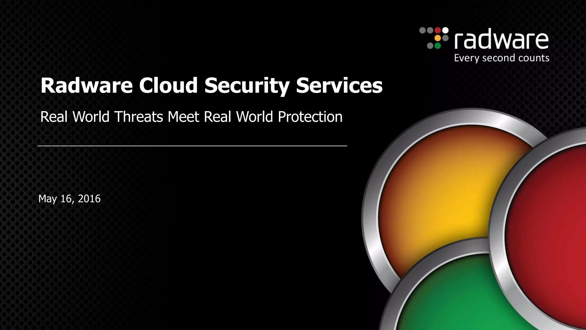 Radware provides cloud-based web application firewall (WAF) and distributed denial of service (DDoS) protection services to help organizations address evolving security threats. The services use Radware's security technologies and are fully managed by Radware security experts. The WAF service provides continuously adaptive protection against known and unknown attacks. The DDoS service offers over 2Tbps of mitigation capacity and has protected organizations from large multi-vector DDoS campaigns. Both services are designed to provide strong security with minimal management requirements.