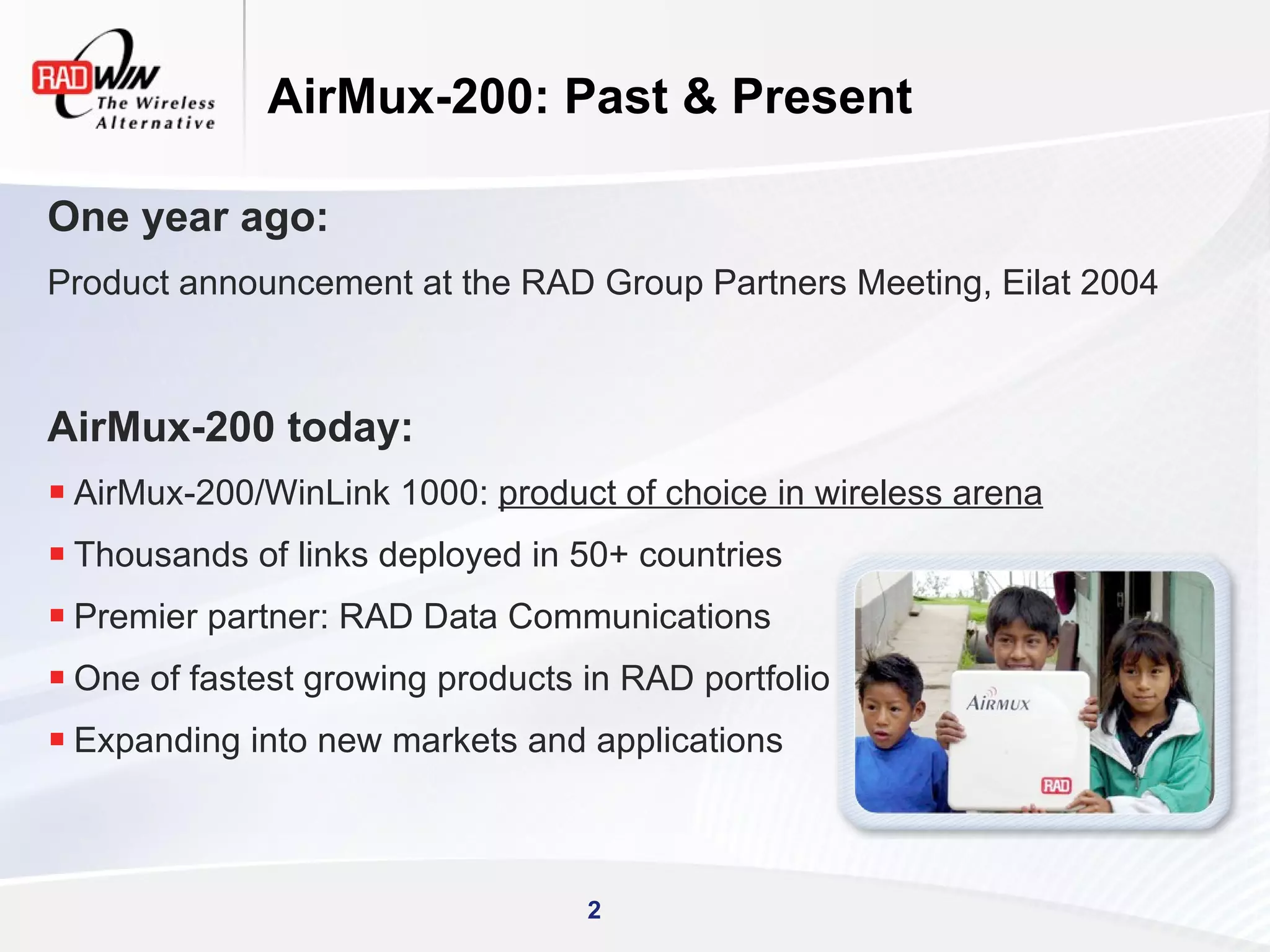 This document discusses RADWIN's AirMux-200 wireless broadband product. In three sentences: