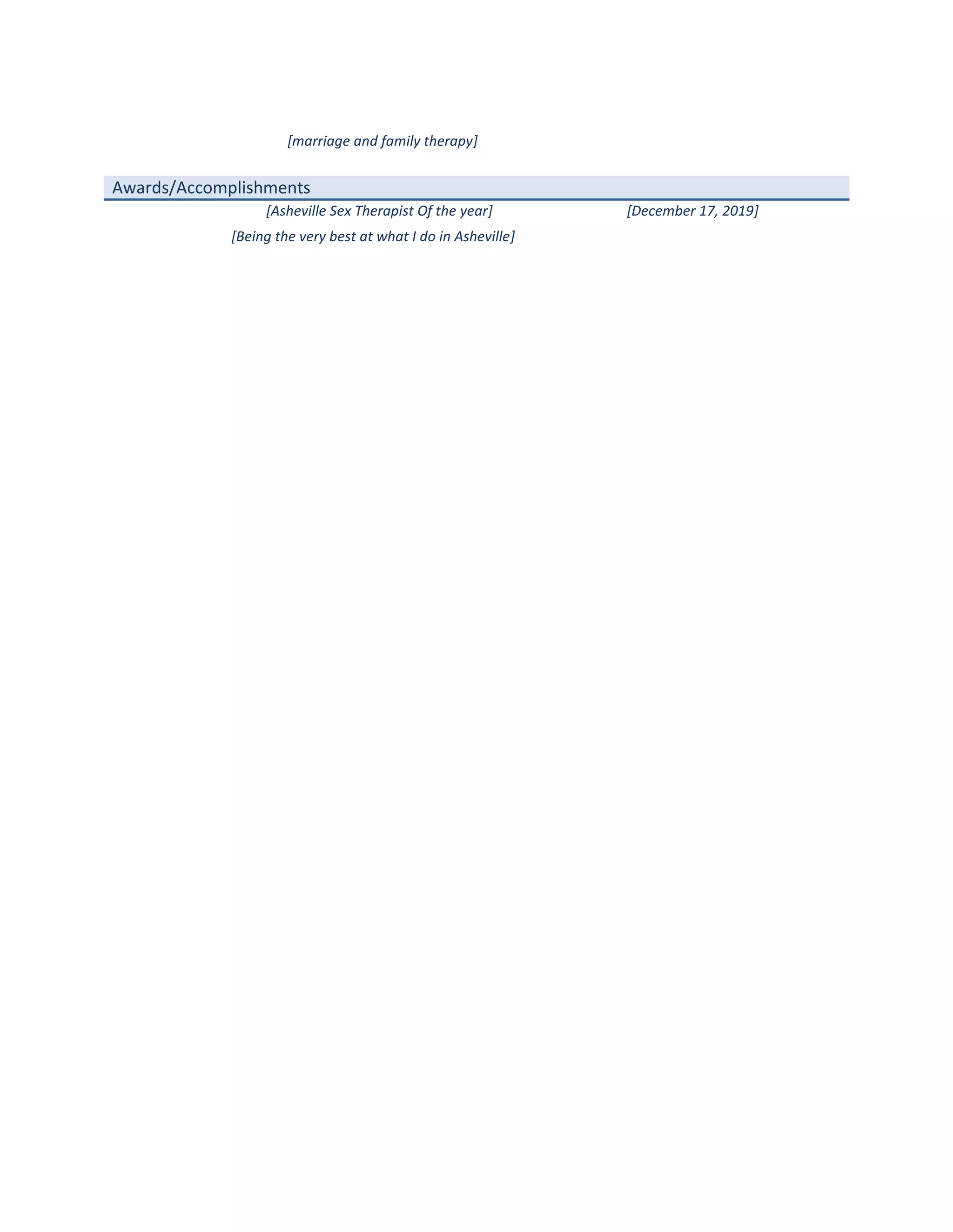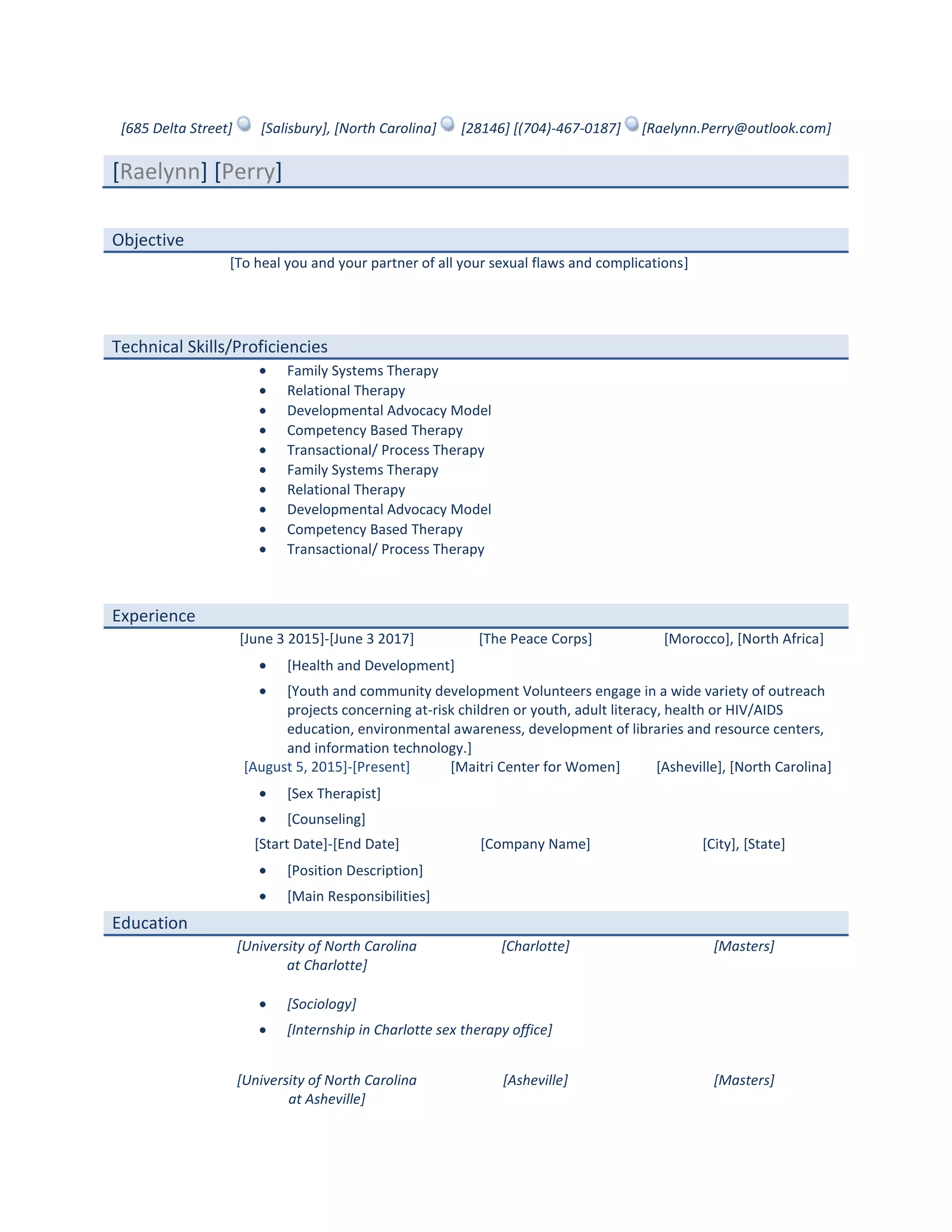 This document contains contact information and a summary of the qualifications and experience of Raelynn Perry, who works as a sex therapist. It lists her objective as healing clients of their sexual flaws and complications. It provides details of her education, including masters degrees in sociology and marriage and family therapy, as well as her experience working for the Peace Corps in Morocco and as a sex therapist in Asheville, North Carolina.