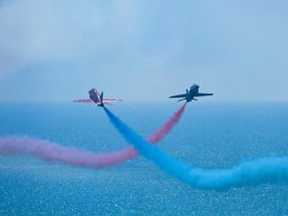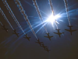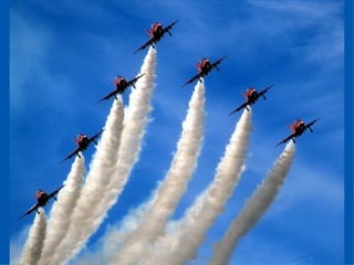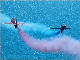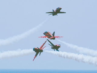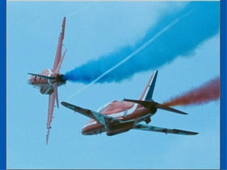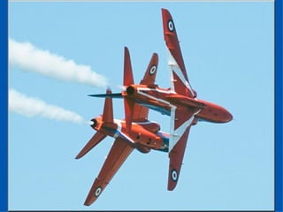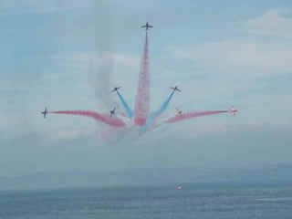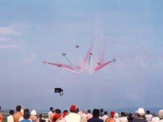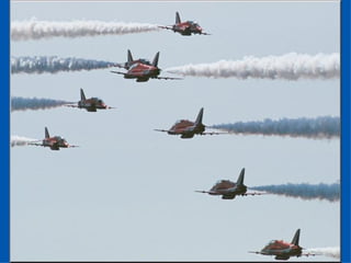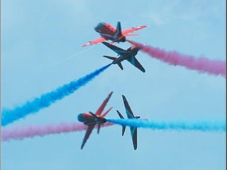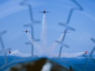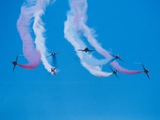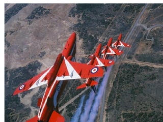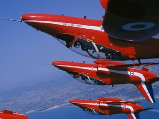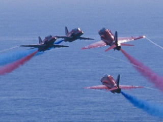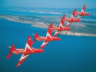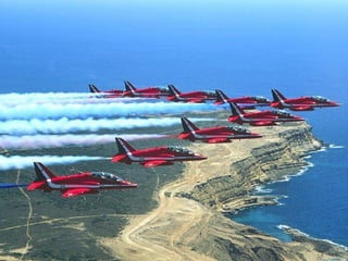 The Red Arrows are a aerobatic display team of the Royal Air Force based at RAF Scampton. They perform aerobatic maneuvers in Hawk T1 jets both individually and as a group demonstrating precision and teamwork. Their displays are intended to promote British aviation interests and excellence.