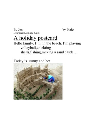 The document contains several holiday postcards from children to friends and family members. The postcards describe enjoying activities like swimming, beach volleyball, fishing, and visiting attractions. The weather is commonly described as sunny. Senders express having a great time on their holidays and not wanting the holidays to end.
