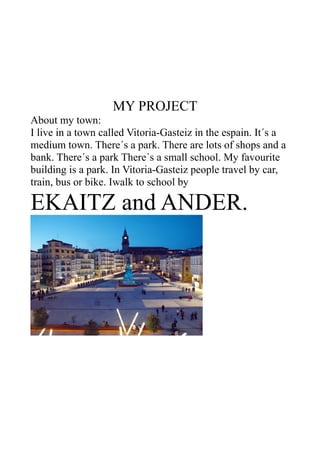 The students live in the town of Vitoria-Gasteiz in Spain. Vitoria-Gasteiz is described as a small to medium sized town with several shops, supermarkets, parks, cafes, cinemas, and museums. The students enjoy visiting the parks, swimming pools, and ice skating rinks. Most residents travel by car, bus, train, tram, bike or walk. Some students note taking a school bus or walking to their nearby schools.