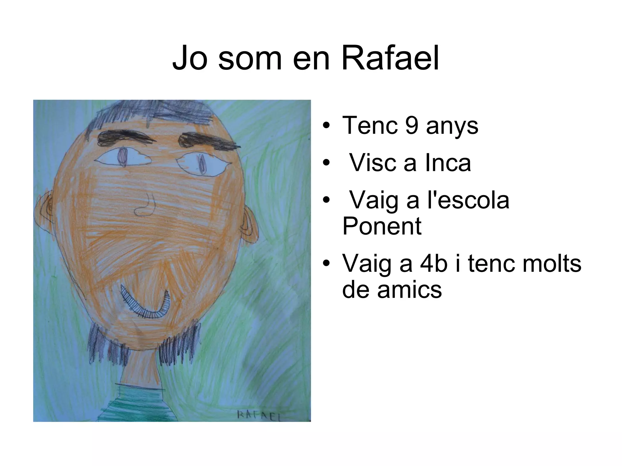 Jo som enRafael Tenc 9 anys Visc a Inca Vaig a l'escola Ponent Vaig a 4b i tenc molts de amics