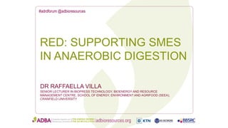 Dr. Raffaella Villa discusses the Bio-Thermal RED project at Cranfield University, which provides support to SMEs in anaerobic digestion. The project includes an AD pilot plant facility available to SMEs, as well as workshops and project-based grants of £1000-5000. So far the project has supported 40 companies through workshops and approved funding for 18 projects involving areas like small-scale biogas plants, silage management best practices, and modular farm-scale digesters. The overall goal is to help SMEs develop renewable energy technologies and applications.