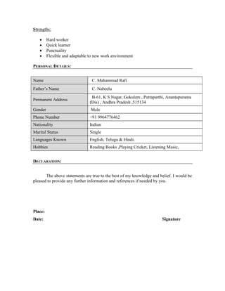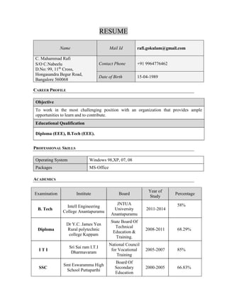 1) This is a resume for C. Mahammad Rafi providing his contact information, education history, skills, and experience.
