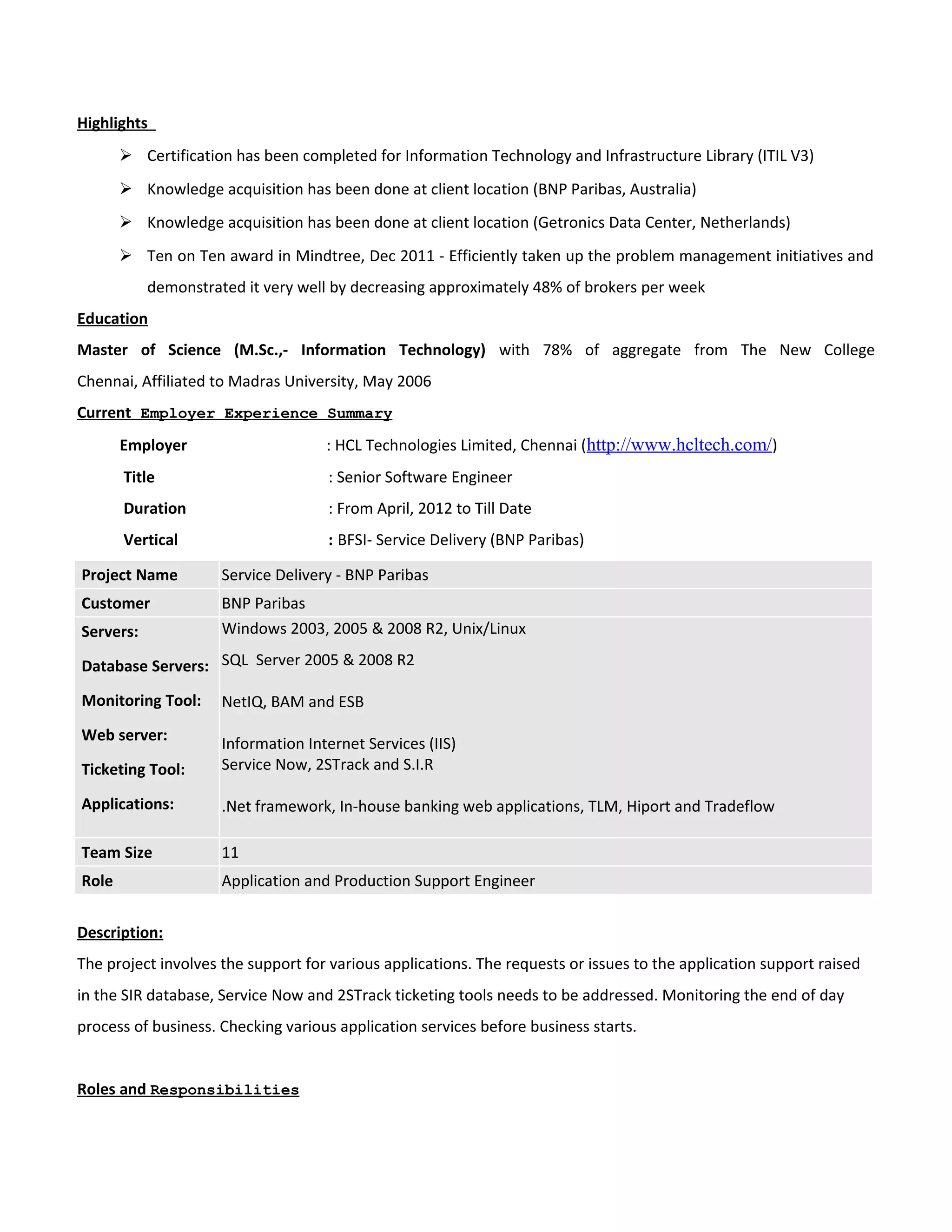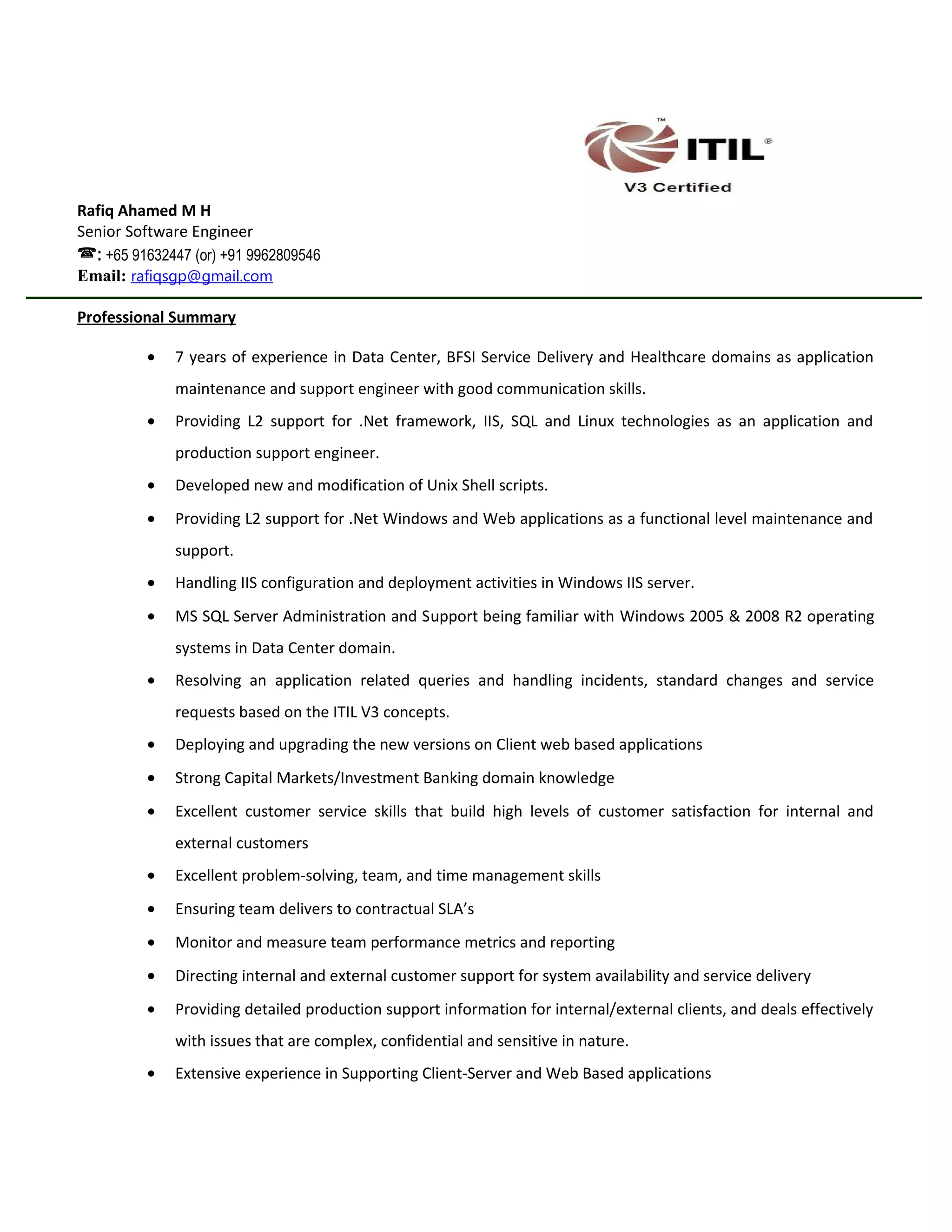 Rafiq Ahamed M H is a senior software engineer with 7 years of experience providing level 2 support for applications in data center, banking, and healthcare domains. He has experience maintaining and supporting .NET, SQL, Linux, and Windows applications and infrastructure. His responsibilities have included application deployment, monitoring, troubleshooting, and resolving production issues according to SLAs.
