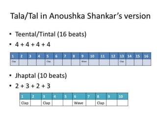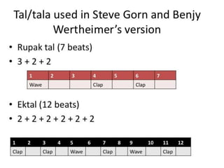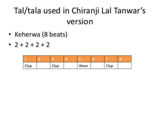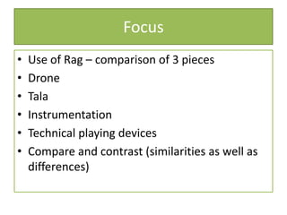 This document provides information about the Indian classical music form of Rag Desh. It discusses the drone, tala (rhythmic cycle), and instrumentation used in three different recorded pieces. It also outlines various melodic and rhythmic playing techniques commonly found in Rag Desh performances, such as improvisation, meends, tans, chands, tihais, jhallas, and bols. The document compares and contrasts the different elements used across the three pieces.
