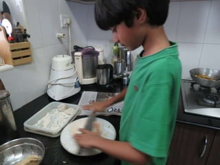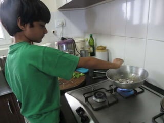 Raghav spent his day in the kitchen preparing several dishes like aloo capsicum subzi, chappathis, grilled cheese and vegetable sandwich, guacamole, pizza, aloo tikkis, idlis, and cornflakes cookies. He peeled, grated, and cut vegetables, kneaded pizza dough, mashed potatoes, and made special pizza surprise for his dad.