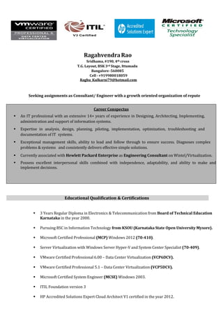 RagahvendraRao is seeking a position as a consultant or engineer with a growth-oriented company. He has over 14 years of experience in IT systems design, implementation, administration and support. He is currently an engineering consultant at Hewlett Packard Enterprise focusing on Windows, virtualization and cloud computing solutions. He has various technical certifications and has led many projects involving data center design, consolidation, virtualization and migration.